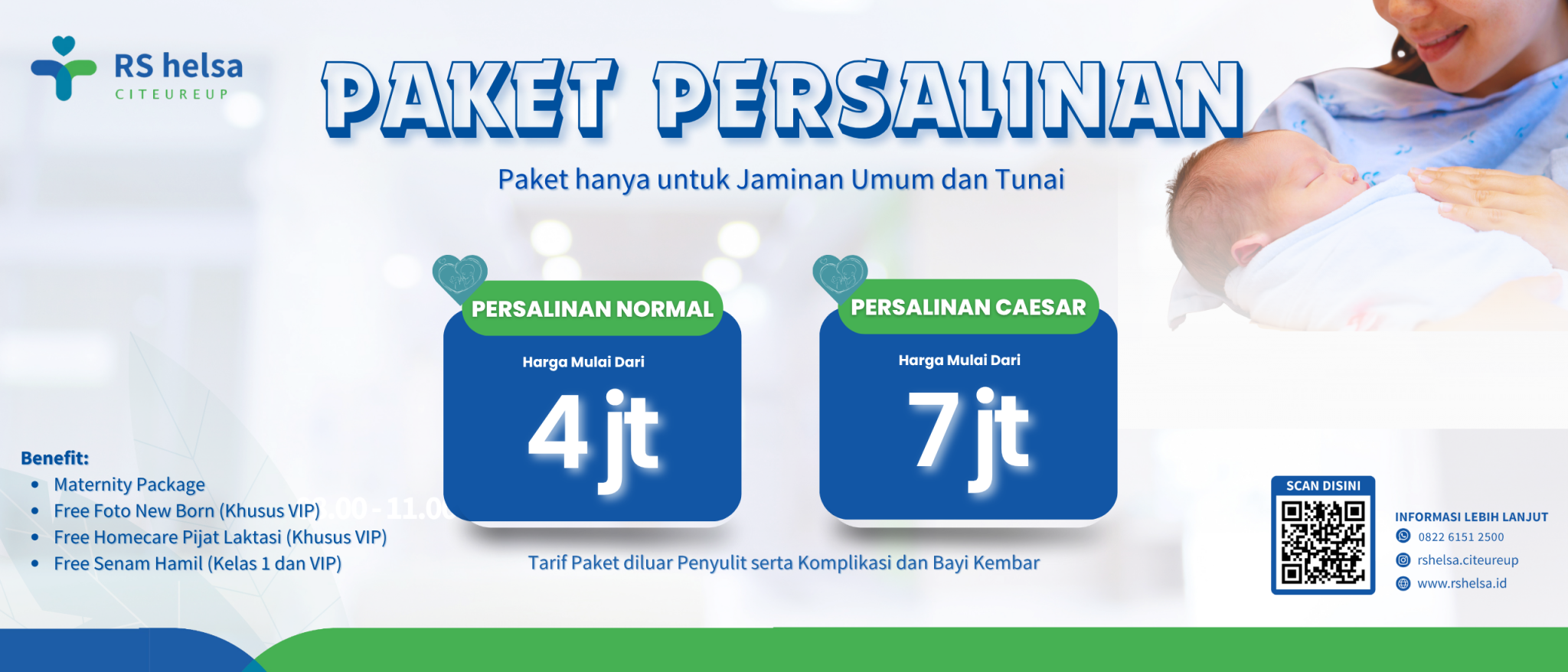 Free senam hamil (kelas 1 & VIP), foto newborn & pijat laktasi (khusus VIP), serta maternity package.
